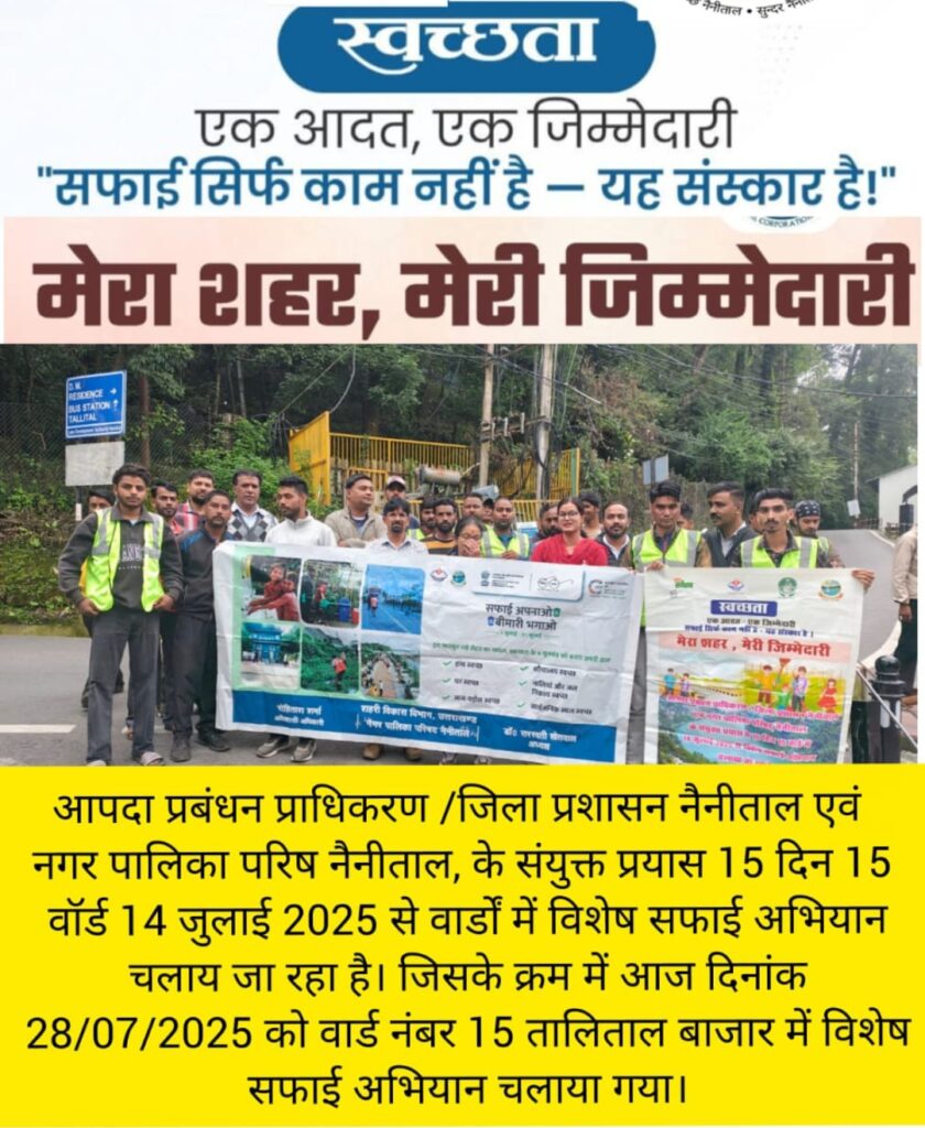 नैनीताल। आपदा प्रबंधन प्राधिकरण /जिला प्रशासन नैनीताल एवं नगर पालिका परिषद नैनीताल के संयुक्त तत्वावधान में 15 दिन 15 वार्डों में विशेष सफाई अभियान चलाया गया । जिसके तहत अंतिम वार्ड 15 तल्लीताल बाजार में विशेष सफाई अभियान चलाया गया।