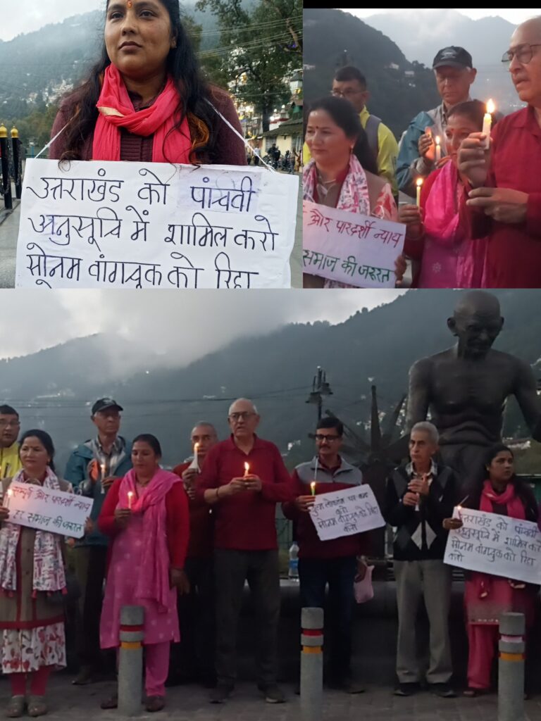 लद्दाख के पर्यावरणविद् वैज्ञानिक और आविष्कारक सोनम वांगचुक को रिहा करने की मांग को लेकर विभिन्न संगठनों ने नैनीताल स्थित गांधी चौक पर सभा कर कैंडल जलाकर किया प्रदर्शन