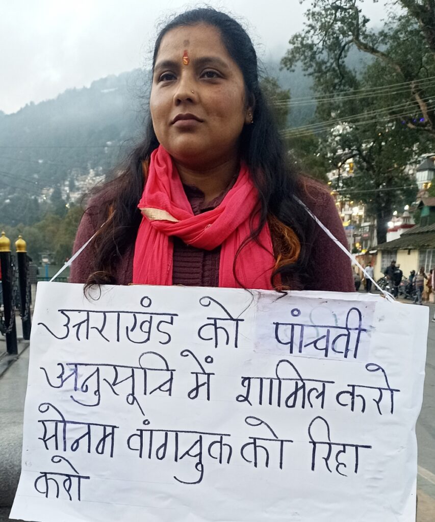 आंदोलन शुरू किया तो हिंसा करने के आरोप में उन्हें गंभीर धाराओं में गिरफ्तार कर जेल भेज दिया गया। उन्होंने कहा इस तरह का व्यवहार देश के लोग बर्दाश्त नहीं करेगा।आंदोलन कर रहे लोगों ने तख्तियाँ और सोनम वांगचुक के चित्र और स्लोगन के साथ गांधी चौक पर कैंडल हाथों में लेकर नारेबाजी की। खष्टी बिष्ट ने सरकार को आडे हाथ लेते हुए पर्यावरण विद् वांगचुक की गिरफ्तारी पर रोष व्यक्त करते हुए कहा कि