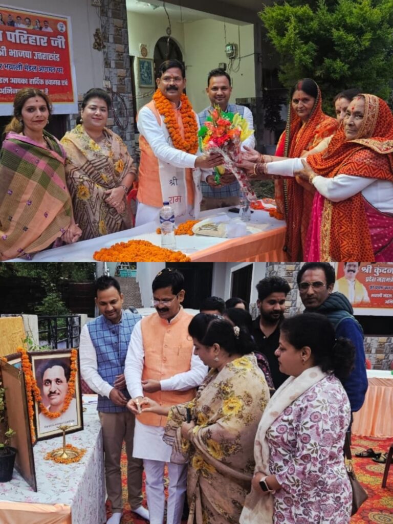 भवाली। भारतीय जनता पार्टी के प्रदेश महामंत्री कुंदन परिहार का पहली बार भवाली आगमन पर कार्यकर्ताओं ने उनका जोरदार स्वागत करते हुये फूलमालाओं से सुसज्जित अंग वस्त्र भेंट कर उनका अभिनंदन किया अपने संबोधन में परिहार ने कहा कि भाजपा का असली बल कार्यकर्ता हैं उन्होंने कहा “कार्यकर्ता ही संगठन की शक्ति और आत्मा हैं” परिहार ने कार्यकर्ताओं से आह्वान किया कि सभी मिलकर पार्टी व प्रधानमंत्री नरेंद्र मोदी के स्वदेशी अभियान की विचारधारा को जनता तक पहुँचाए कहा कि मुख्यमंत्री पुष्कर सिंह धामी के नेतृत्व वाली प्रदेश सरकार लगातार जनहित के निर्णय ले रही है जो विकास के लिए प्रतिबद्ध है। कार्यक्रम में मण्डल अध्यक्ष हिमांशु बिष्ट, महिला मोर्चा प्रदेश महामंत्री भावना मेहरा, जिला उपाध्यक्ष डा प्रगति जैन ने संबोधित किया। इस दौरान प्रकाश आर्या, पूर्व पालिकाध्यक्ष संजय वर्मा, शिवांशु जोशी, कंचन साह, प्रेम सिंह नेगी, शुभम कुमार, अमित पांडेय, मोहित कुमार, अंशुमान सिंह दफोटी, हिमांशु रावत, आयुष कुमार, कमला आर्या, अंश चौधरी, इशांत मेहरा, कृष नेगी, नीतू जोशी, भगवती मेहरा, धनी मेहरा,लता शर्मा ,गीता पाठक आदि मौजूद रहे।कार्यक्रम का संचालन वर्षा आर्या ने किया ।
