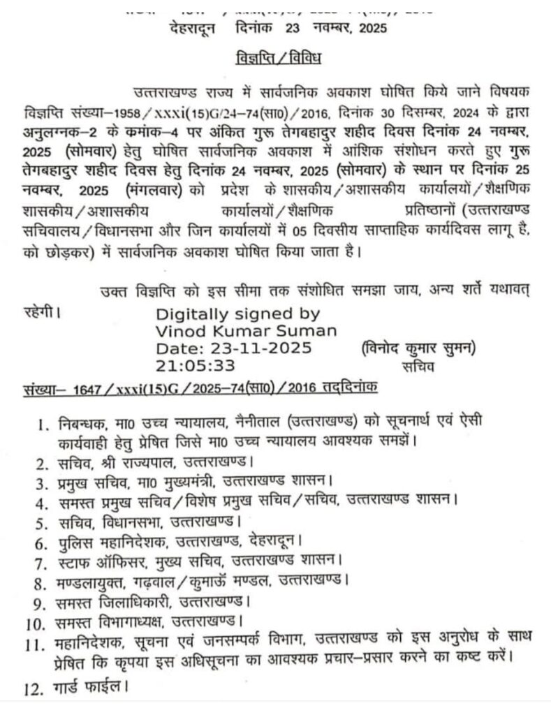 Blog सूचना जानें -सार्वजनिक अवकाश सोमवार नहीं बल्कि मंगलवार को Suresh Kandpal 23 November 2025 0 नैनीताल। गुरू तेग बहादुर शहीदी दिवस दिनांक 24 नवम्बर, 2025 (सोमवार) हेतु घोषित सार्वजनिक अवकाश में आंशिक संशोधन करते हुए दिनांक 25 नवम्बर, 2025 (मंगलवार) को सार्वजनिक अवकाश घोषित किया गया है। Continue Reading Previous सनवाल स्कूल के स्पोर्ट्स शिक्षक विनय साह की माता का निधन, कल 24 नवंबर को किया जाएगा अंतिम संस्कारNext नैनीताल में बर्फ की तरह घरों की छत में खूब जमने लगा पाला, पाला पड़ने से ठिठुरन बढी़ More Stories Blog अमेरिकन किड्स प्ले स्कूल का 16वां स्पोर्ट्स डे धूमधाम के साथ मनाया, भारवी जोशी को दिया गया स्टूडेंट ऑफ द ईयर का पुरस्कार Suresh Kandpal 1 December 2025 0 Blog सभासद मनोज साह जगाती ने विभिन्न प्रमाण पत्र वनाने का फिर से लगवाया कैंप, 55 लोगों के बने विभिन्न प्रमाण पत्र Suresh Kandpal 30 November 2025 0 Blog नैनीताल शहर के समाजसेवी लोकेश जोशी बने सलाहकार समिति के सदस्य, बधाई देने वालों का लगा तांता Suresh Kandpal 30 November 2025 0 Leave a Reply Cancel replyYour email address will not be published. Required fields are marked *Comment * Name * Email * Website Save my name, email, and website in this browser for the next time I comment.