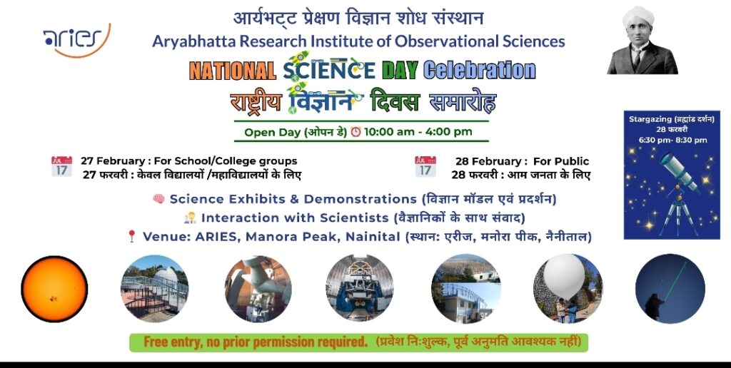 मनोरा पीक, नैनीताल स्थित आर्यभट्ट प्रेक्षण विज्ञान शोध संस्थान (एरीज) में 27-28 फरवरी को सुबह 10:00 बजे से शाम 4:00 बजे तक राष्ट्रीय विज्ञान दिवस कार्यक्रम आयोजित किया गया है। एरीज में शुक्रवार 27 फरवरी को विद्यालयों तथा महाविद्यालयों के लिए “ओपन डे” है, जिसमें शिक्षक और विद्यार्थी प्रतिभाग कर सकते हैं। शनिवार 28 फरवरी को आम जनता के लिए सार्वजनिक “ओपन डे” कार्यक्रम आयोजित किया गया है।