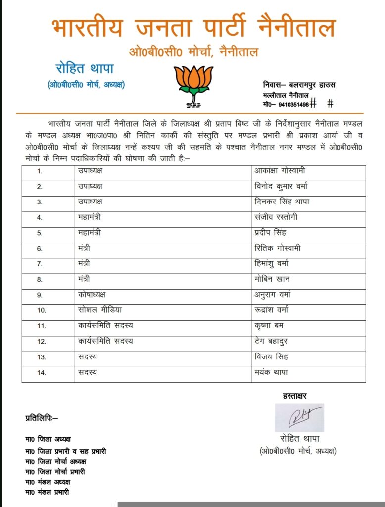नैनीताल। भारतीय जनता पार्टी नैनीताल जिले के जिलाध्यक्ष प्रताप बिष्ट के निर्देशानुसार नैनीताल मण्डल के मण्डल अध्यक्ष भाजपा नितिन कार्की की संस्तुति पर मण्डल प्रभारी प्रकाश आर्या व ओबीसी मोर्चा के जिलाध्यक्ष नन्हें कश्यप की सहमति के पश्चात नैनीताल नगर मण्डल में ओबीसी मोर्चा के अध्यक्ष रोहित थापा ने नैनीताल के संजीव रस्तोगी को महामंत्री की जिम्मेदारी सौंपी है इनके अलावा निम्न पदाधिकारियों की घोषणा की है।